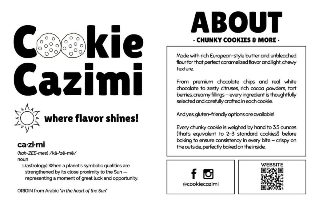 A little background: I run a home bakery in Southern Maryland selling chunky cookies in a variety of flavors. I started Cookie Cazimi in May 2024, became a seasonal vendor at the oldest farmers market in my area by September, and then was accepted as a permanent vendor the following year.